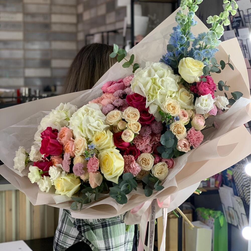 Гортензия – 3 шт.Дельфиниум голубой – 2 шт.Роза – 11 шт.Лизиантус – 3 шт.Хризантема кустовая – 3 шт.Кустовая роза – 3 шт.Эвкалипт – 1 шт.