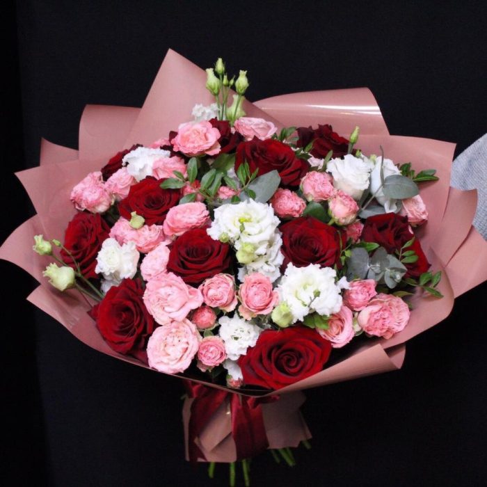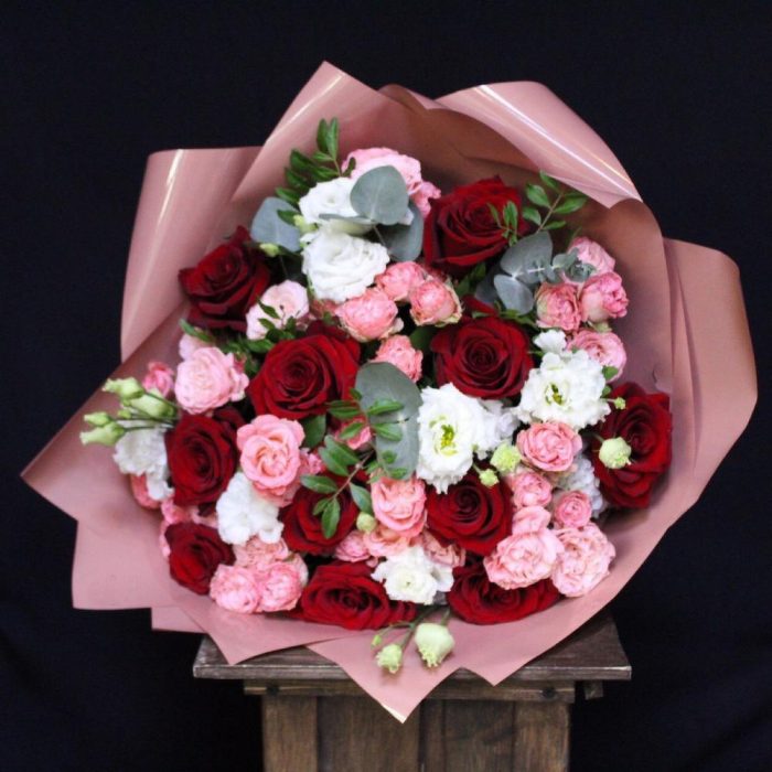 Роза Эксплорер – 11 шт.Роза кустовая пионовидная мадам бомбастик – 10 шт.эустома махровая – 5 шт.Фисташка – 3 шт.Эвкалипт – 2 шт.Пленка дизайнерская – 3 шт.