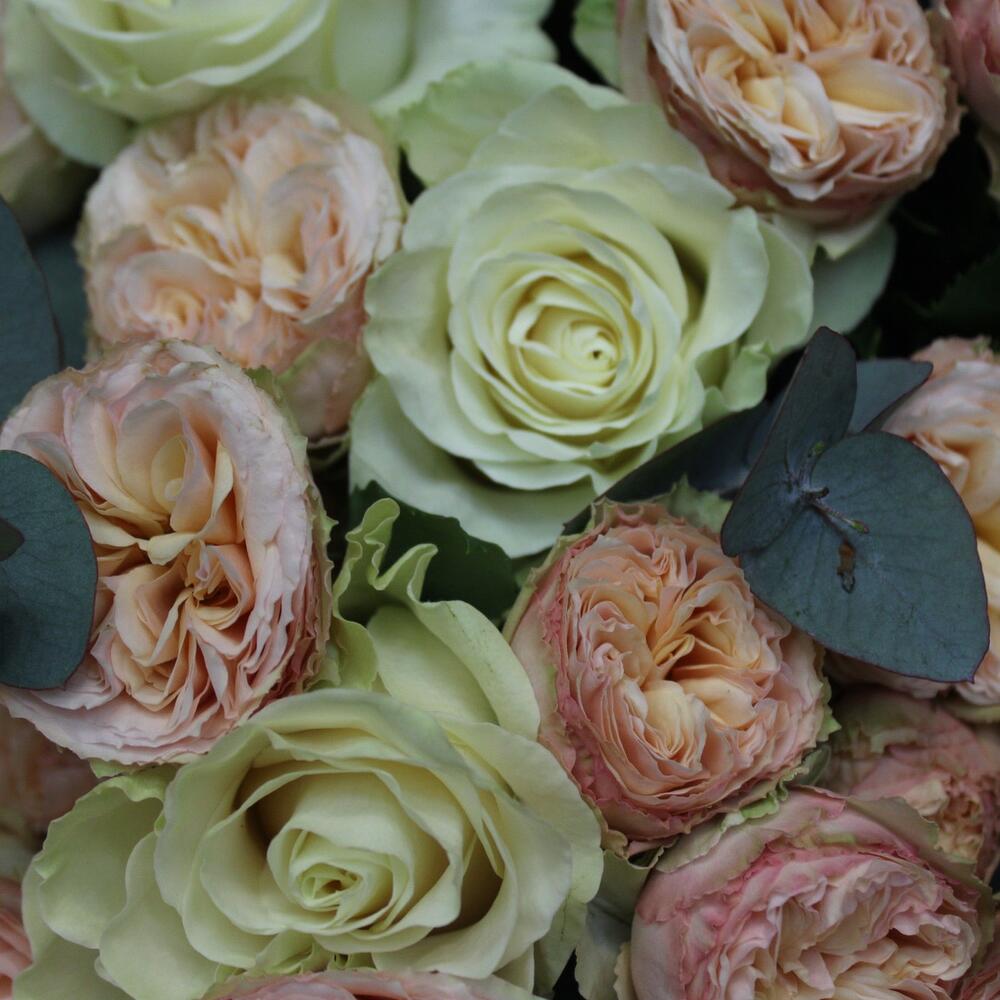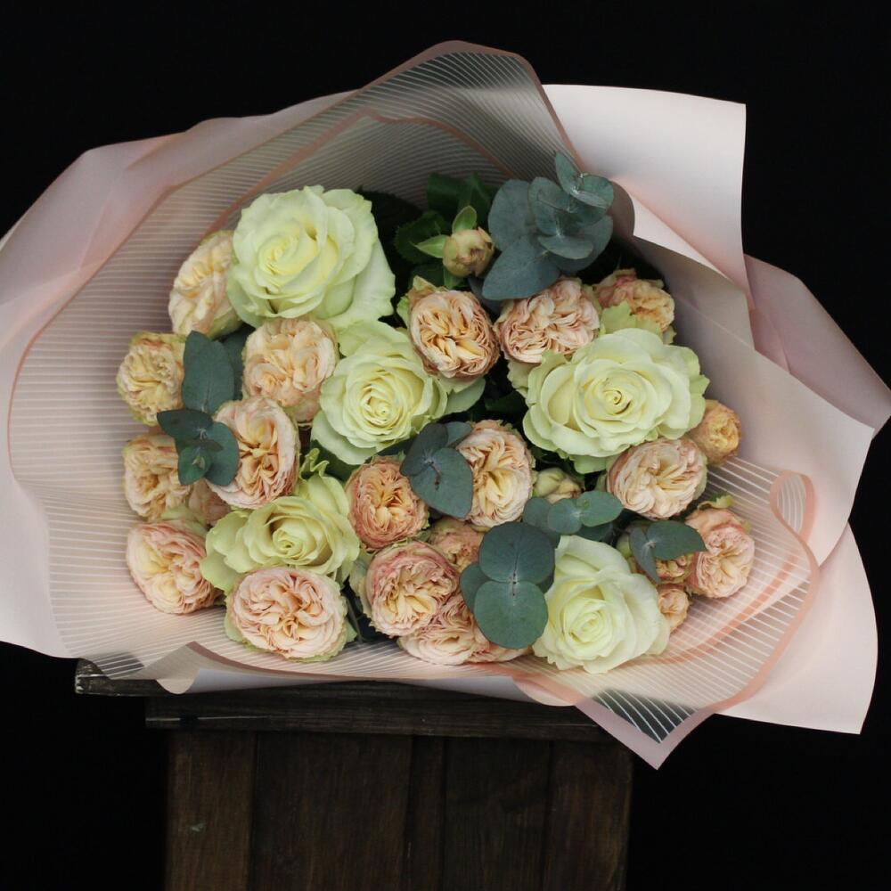 Роза Мондиаль – 5 шт.трендсеттер роза кустовая – 4 шт.Эвкалипт Baby Blue – 3 шт.Пленка матовая – 3 шт.