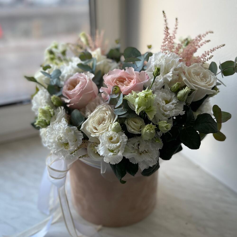 роза садовая дэвид остина – 3 шт.роза пионовидная плайа бланка – 5 шт.Астильба – 2 шт.Эустома белая махровая – 4 шт.эустома розита вайт – 1 шт.Маттиола – 2 шт.Эвкалипт – 3 шт.Оазис флористический – 1 шт.Коробка шляпная – 1 шт.Лента атласная – 2 шт.