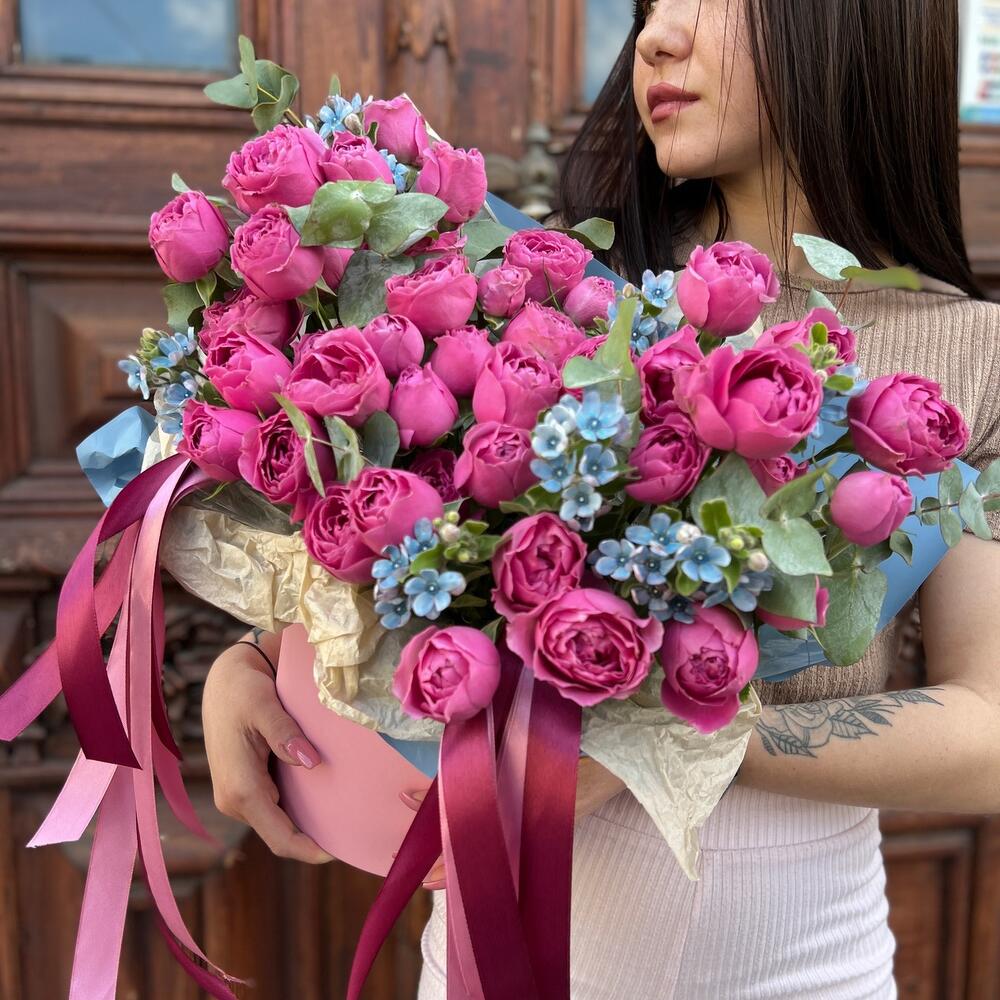 Эвкалипт – 3 шт.Лента атласная – 6 шт.Тишью – 1 шт.Коробка шляпная – 1 шт.Оксипеталум – 7 шт.Пленка матовая – 1 шт.Оазис флористический – 1 шт.роза кустовая мисти бабл – 11 шт.