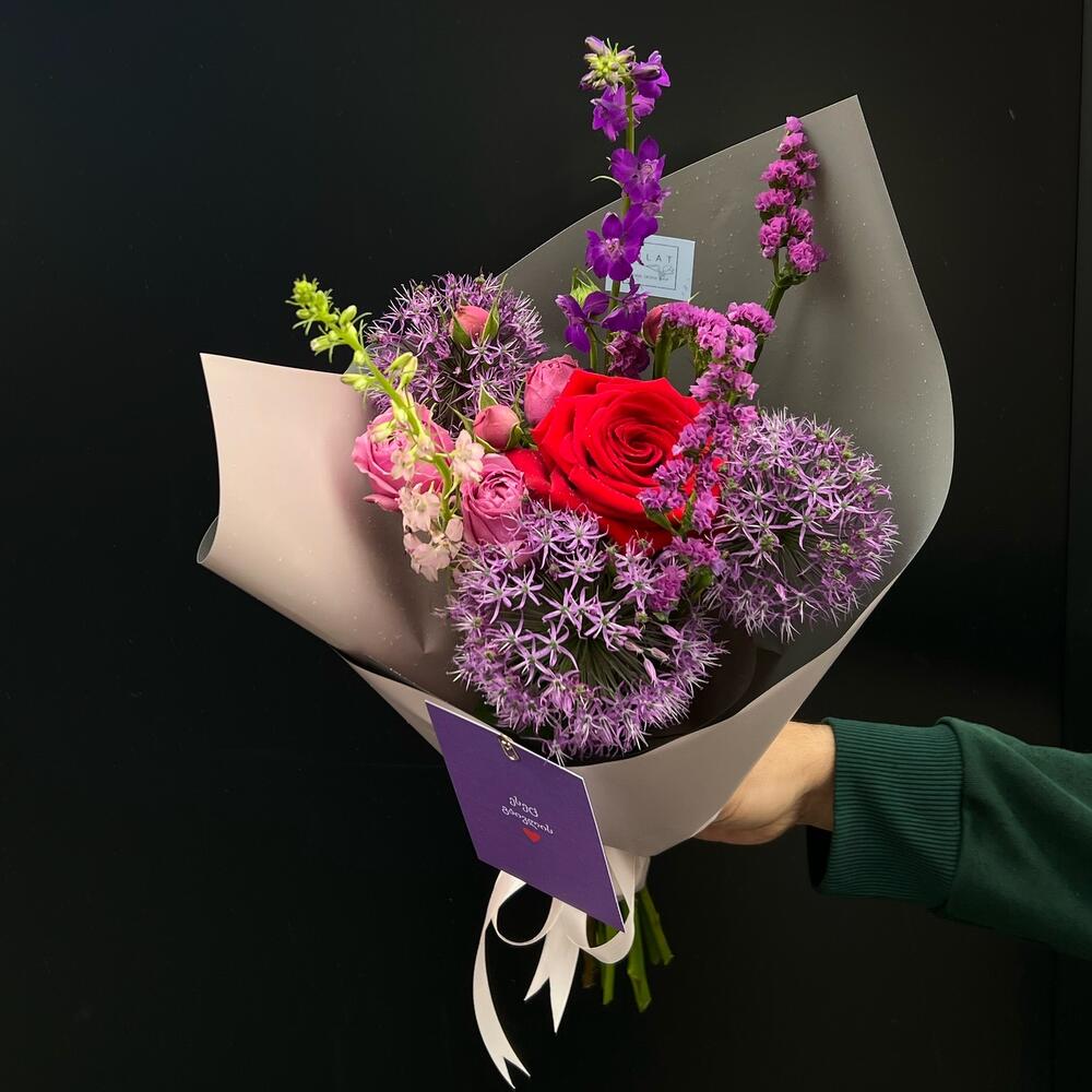 Роза Эксплорер – 1 шт. Луковичные растения – 3 шт. Пионовидная кустовая роза – 1 шт. Лимониум – 2 шт. Упаковка дизайнерская – 1 шт. инструкция по уходу за цветами – 1 шт. Открытка – 1 шт.