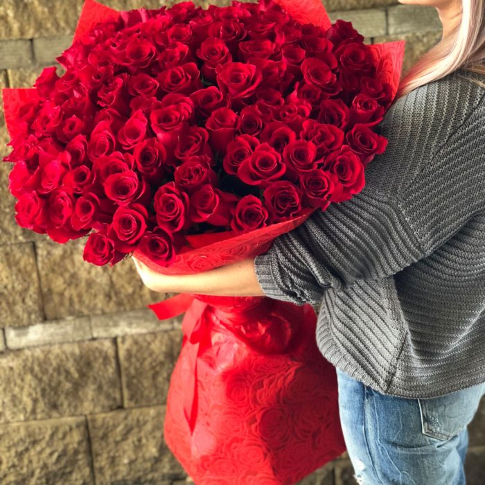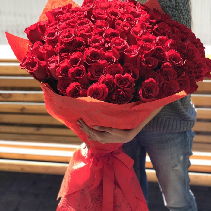 Большой, объемный букет из 101 метровой Розы, стильно упакованный в мешковину. Действительно, шикарный подарок для самой любимой!