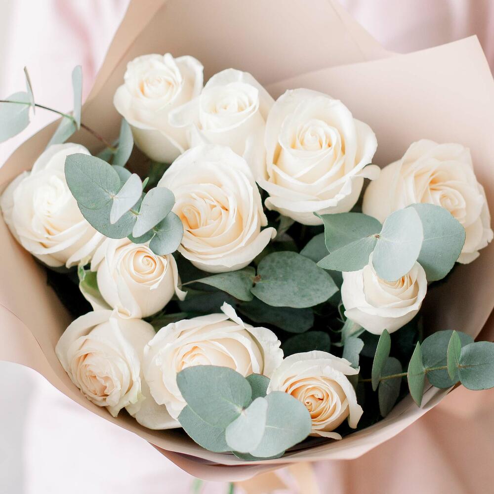 Букет из 11 белых роз (Эквадор) 50 см Vendela с эвкалиптом в кремовой пленке