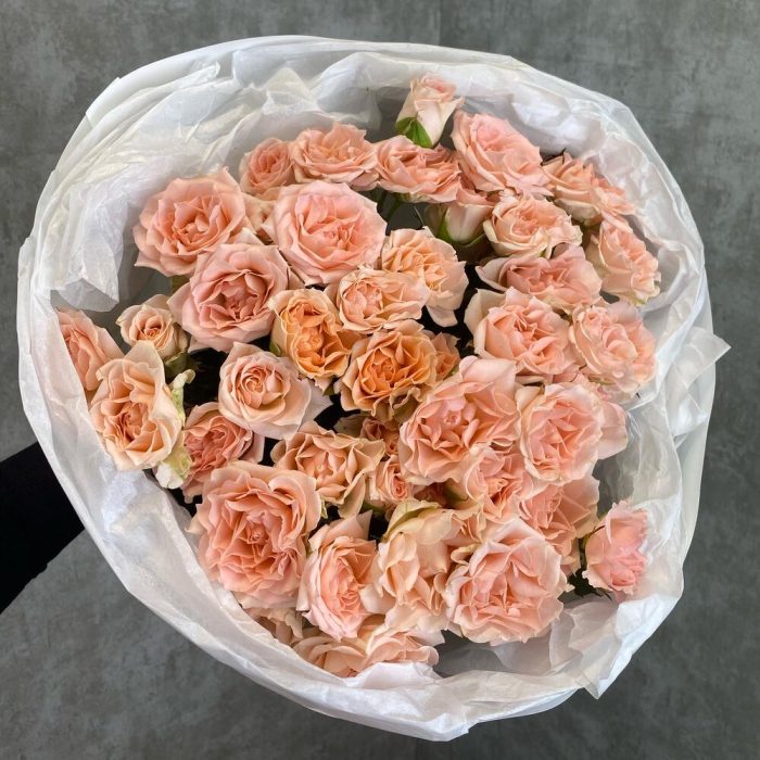 Кустовая роза – 21 шт.Упаковка – 2 шт.Атласная лента – 1 шт.