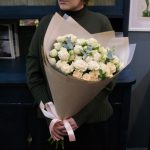 Эвкалипт – 2 шт.Крафт – 1 шт.Атласная лента – 9 шт.Кустовая пионовидная роза – 2 шт.Пленка матовая – 2 шт.