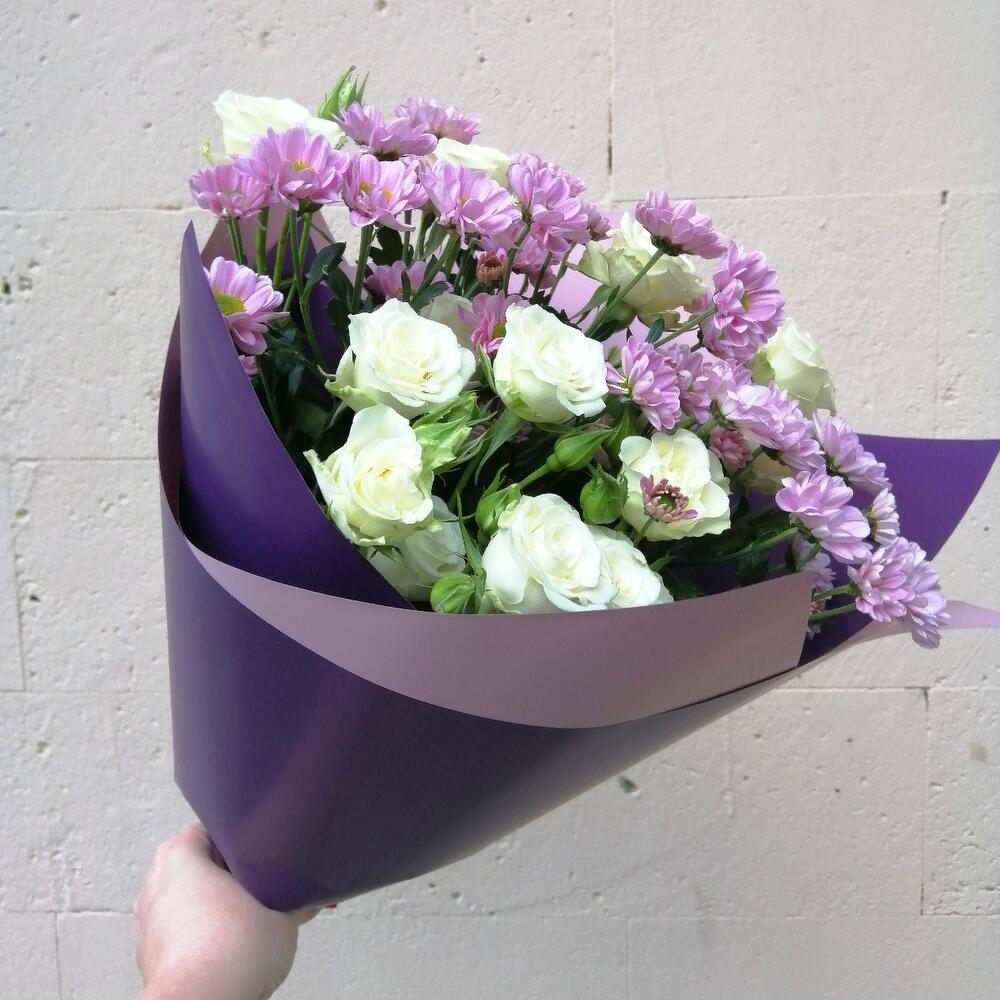 Лента – 1 шт.Роза кустовая – 3 шт.Хризантема Сантини – 4 шт.Упаковка – 1 шт.