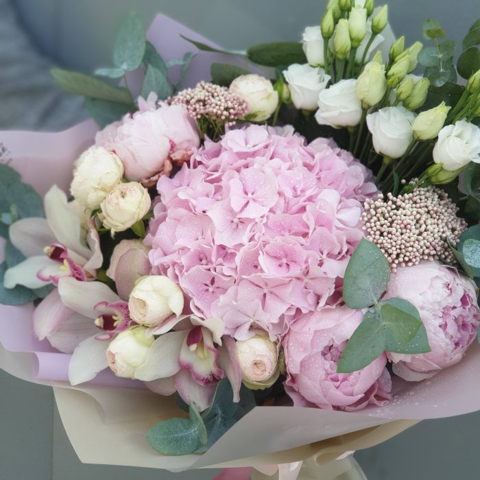 Альстромерии, Гвоздики, Кустовые розы, Лизиантусы, Розы, Хризантемы