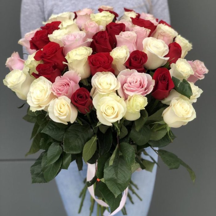 роза красная фридом – 16 шт. Роза белая мондиаль – 20 шт. роза розовая пинк мондиаль – 15 шт. Оформление лента атласная – 1 шт.