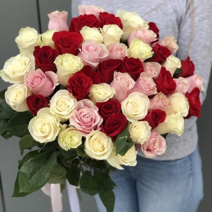 Букет из красных, белых и розовых роз Бабочки внутри меня из 51 розы