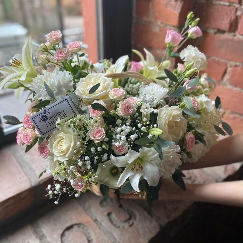 Букет из лилий, гортензии, эустомы, роз, гвоздики и гипсофилы в корзине “Карндона”