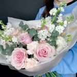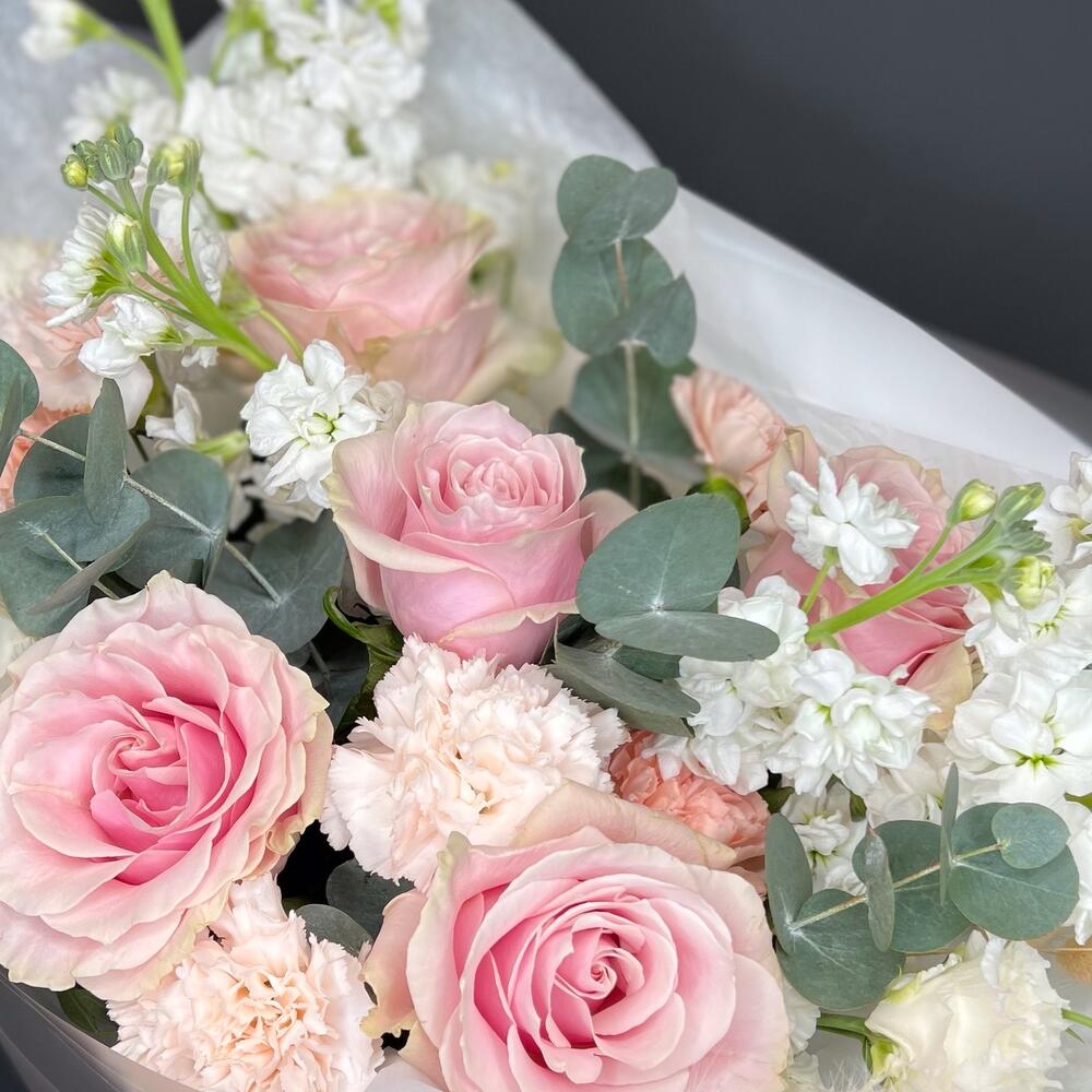 Лизиантус – 2 шт.Маттиола – 6 шт.Роза одноголовая – 5 шт.Диантус – 6 шт.Фисташка – 1 шт.Упаковка дизайнерская – 1 шт.Лагурус – 6 шт.комплимент от polyanka – 1 шт.