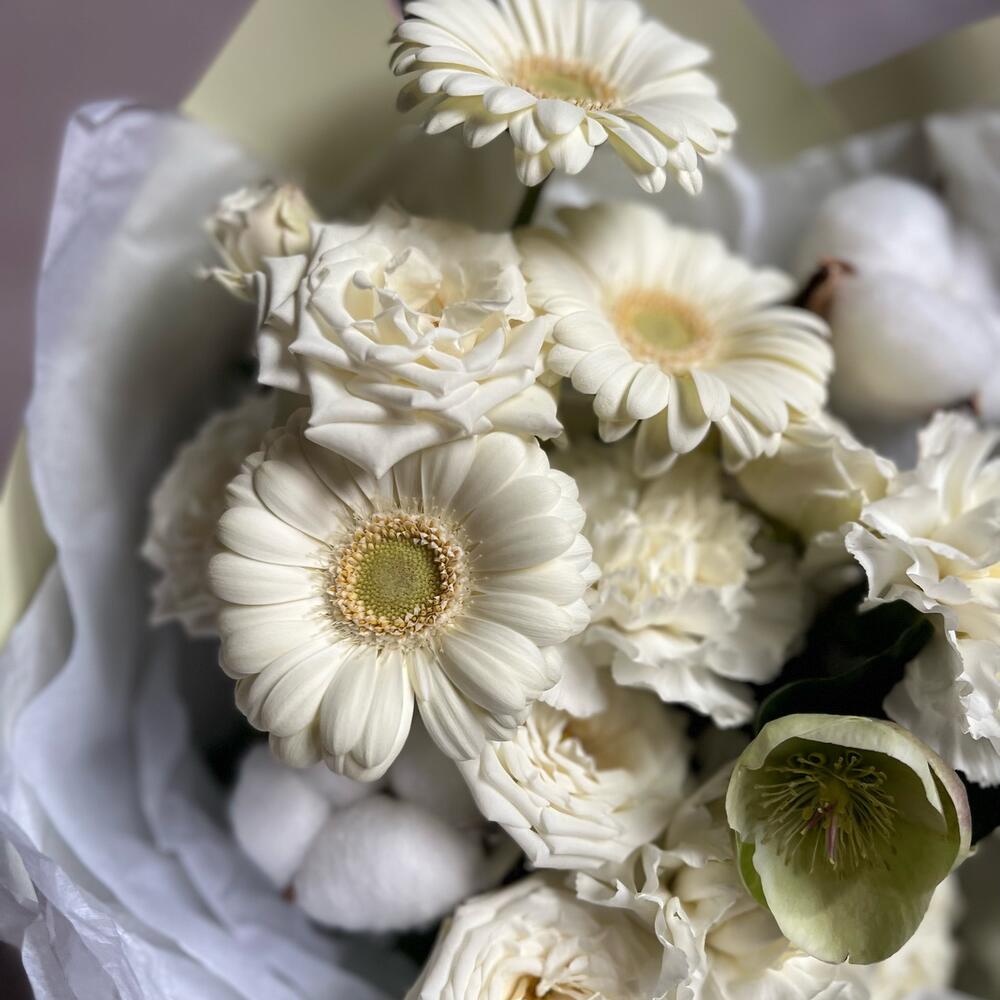 Гербера – 3 шт.Кустовая роза – 2 шт.Хелеборус – 1 шт.Гвоздика – 2 шт.Сухоцветы – 3 шт.декоративная упаковка – 1 шт.Атласная лента – 1 шт.