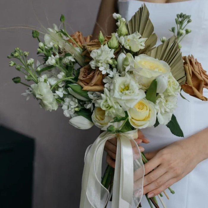 Лизиантус – 2 шт.Маттиола – 3 шт.Тюльпан – 5 шт.Пионовидная роза – 7 шт.Атласная лента – 2 шт.Оксипеталум – 5 шт.рускус сухоцвет – 2 шт.пальмовое копье – 2 шт.японский ранункулюс – 3 шт.