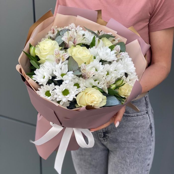 Эвкалипт – 2 шт. Хризантема – 4 шт. Роза белая мондиаль – 5 шт. Альстромерия – 6 шт. Оформление – 1 шт.