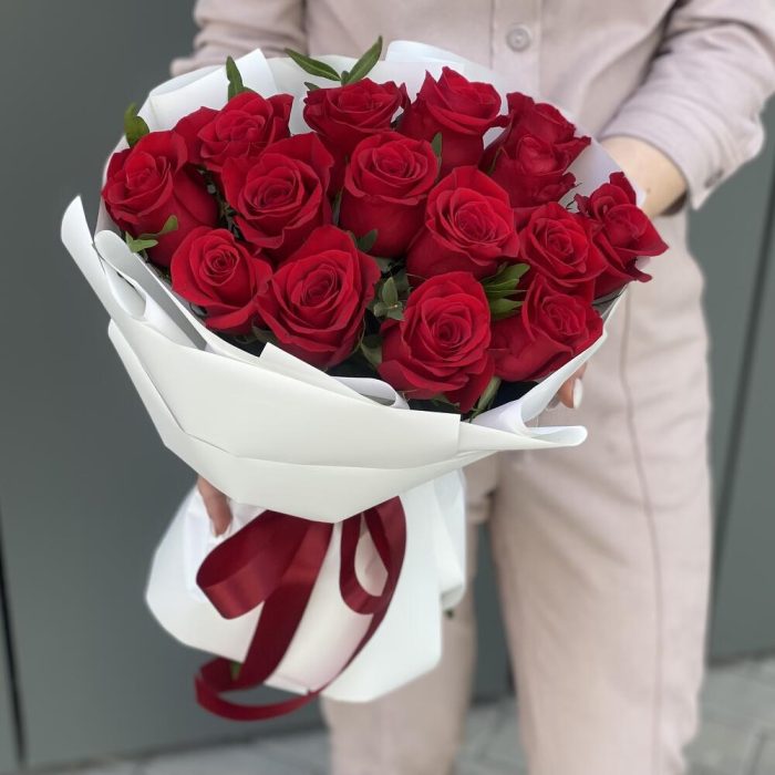 Роза Freedom – 15 шт. Оформление – 1 шт. Эвкалипт парфиволия – 2 шт.