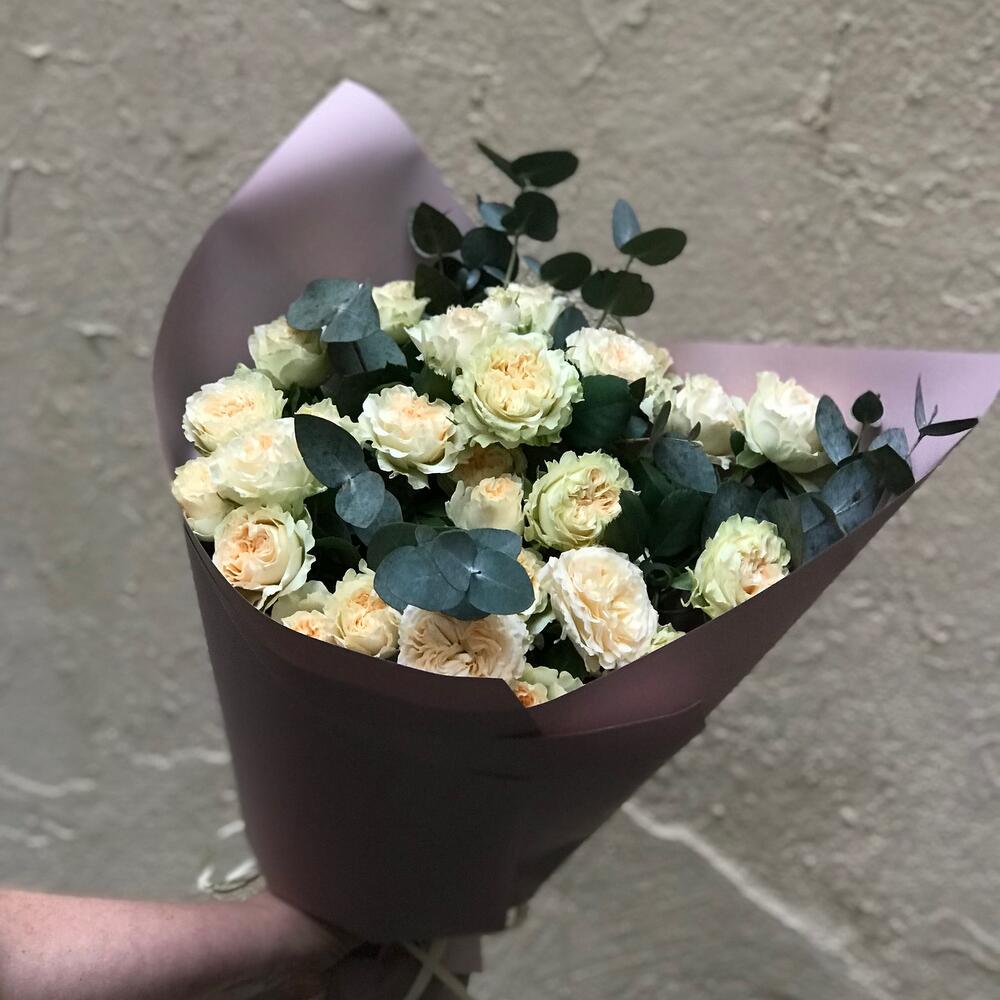 роза кустовая пионовидная саммер – 5 шт.эвкалипт цинерея пучок – 1 шт.Упаковка дизайнерская – 1 шт.