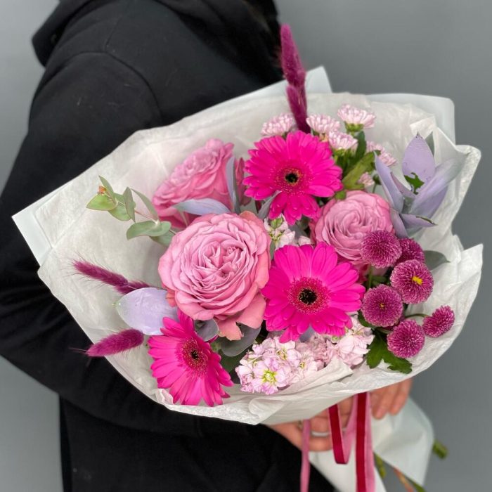 Букет с розами и яркими герберами “Малиновый Гоголь-моголь”