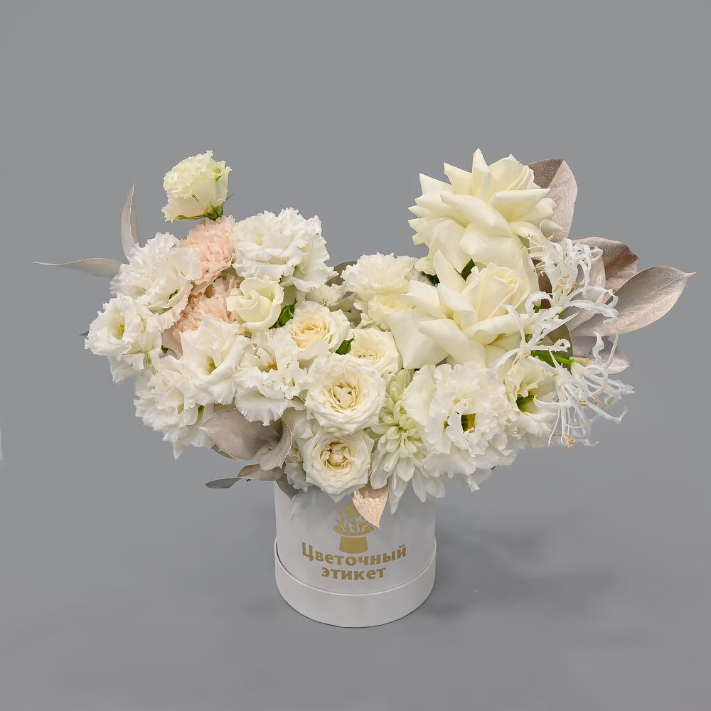 Хризантема – 1 шт.Магнолия – 2 шт.Эустома – 2 шт.Рускус – 3 шт.Роза кустовая – 3 шт.Гвоздика – 2 шт.Нерина – 1 шт.Сантини – 2 шт.Французская роза – 2 шт.Шляпная коробка – 1 шт.