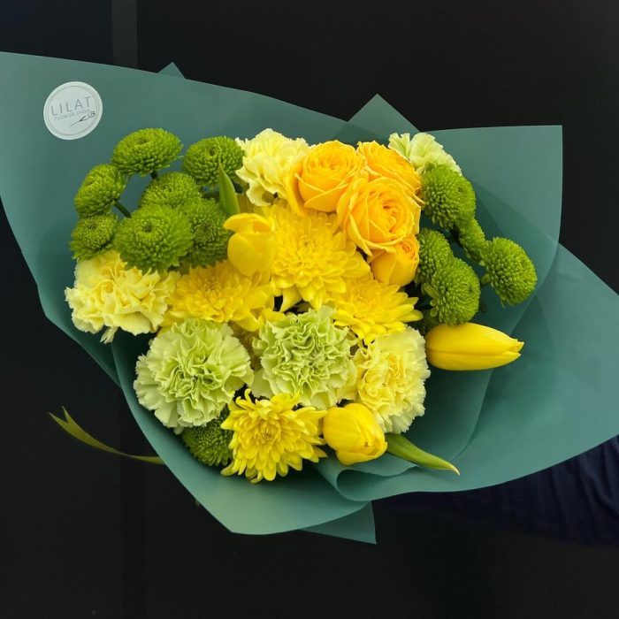 Тюльпан – 3 шт. Хризантема кустовая – 5 шт. Диантус – 5 шт. Упаковка дизайнерская – 3 шт. Открыточка с вашими пожеланиями – 1 шт. инструкция по уходу за цветами – 1 шт. куст роза – 1 шт.