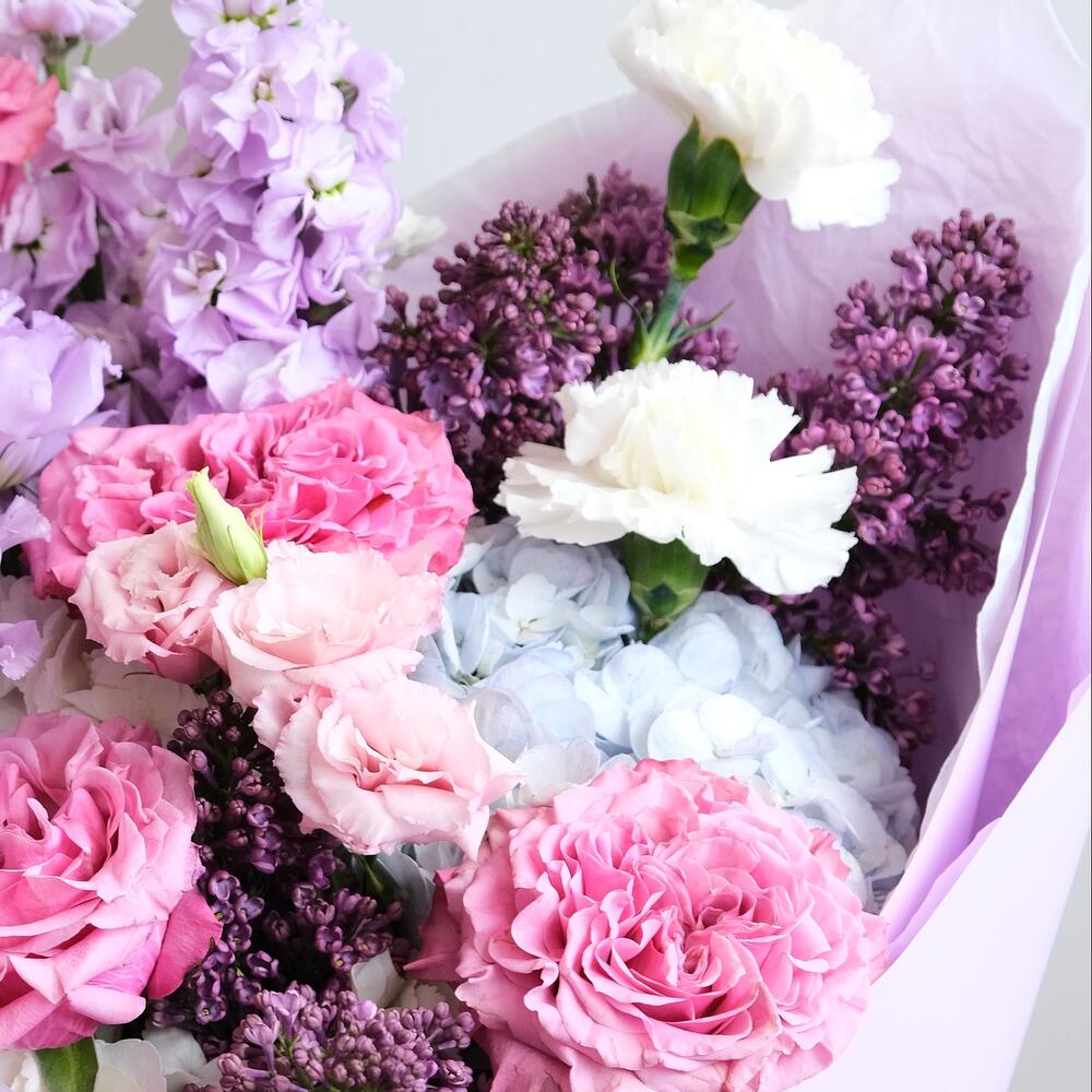 Лизиантус – 2 шт.Сирень – 5 шт.Гвоздика – 3 шт.Гортензия белая – 1 шт.Упаковка дизайнерская – 2 шт.Гортензия голубая – 1 шт.маттиола сиреневая – 2 шт.кантри блю пионовидная роза – 5 шт.