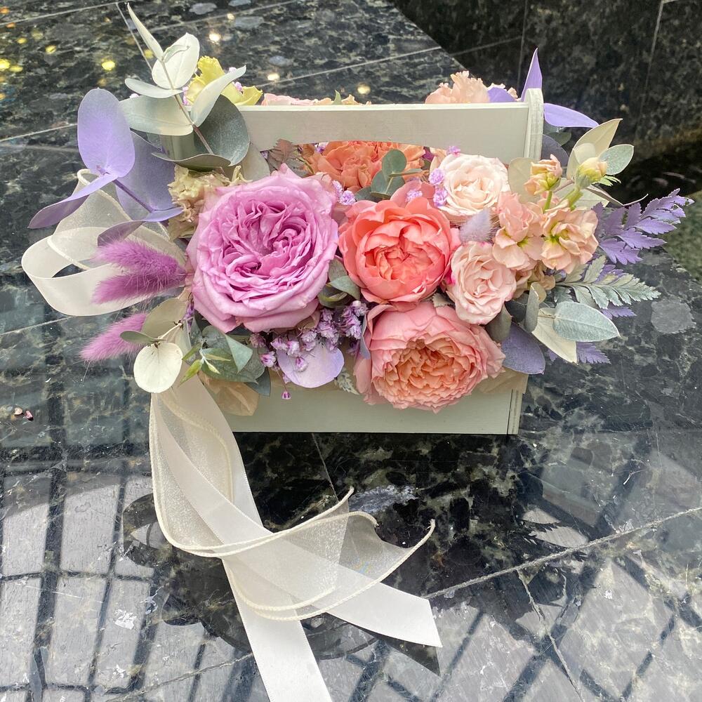 Роза – 1 шт.Роза кустовая – 1 шт.Роза кустовая джульетта – 1 шт.Маттиола – 1 шт.Гвоздика – 2 шт.Эустома – 1 шт.Оазис – 1 шт.Ящик – 1 шт.