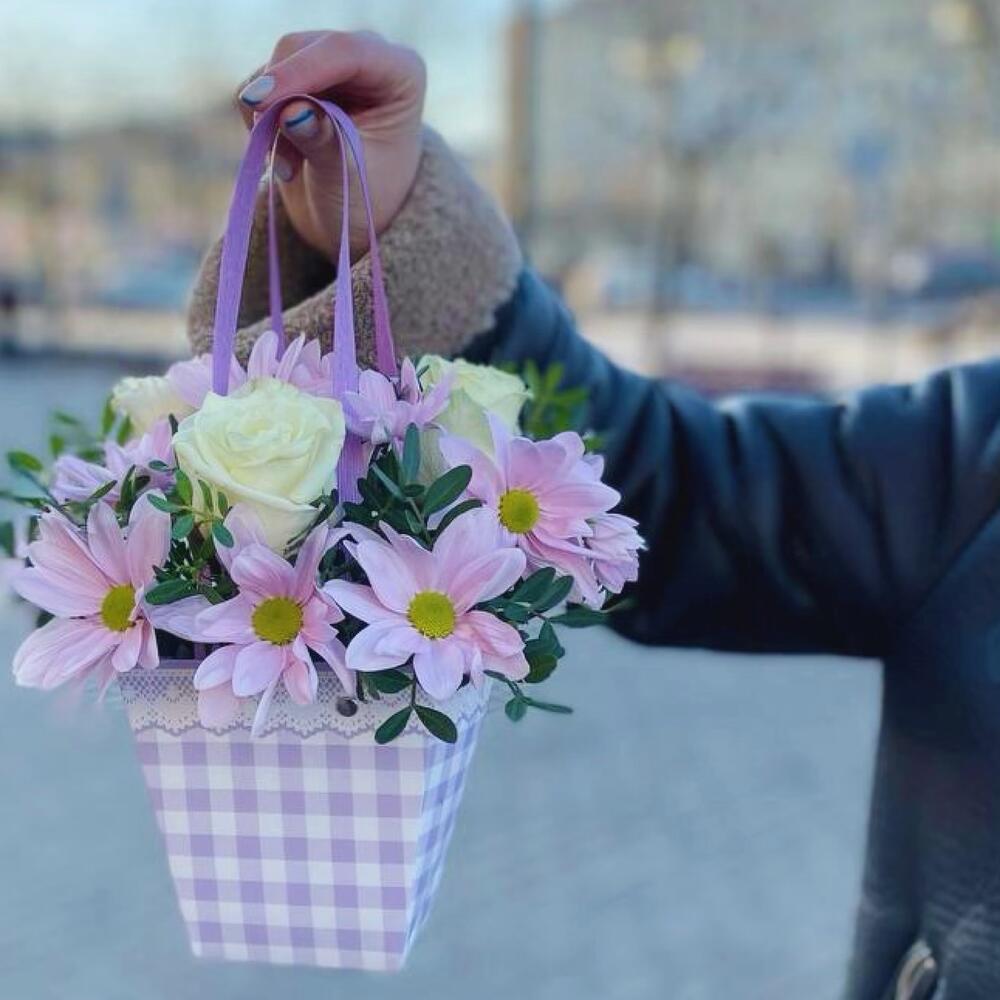 Роза – 3 шт.Хризантема кустовая – 1 шт.Фисташка пучок – 1 шт.Оазис флористический – 1 шт.Сумочка – 1 шт.
