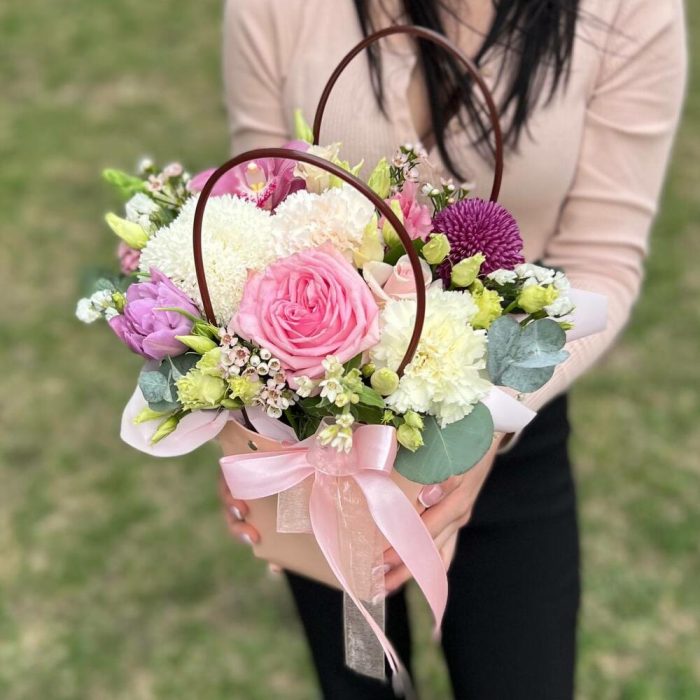 Лимониум – 1 шт.Эустома – 1 шт.Роза пионовидная – 1 шт.Хамелациум – 1 шт.орхидея – 1 шт.Тюльпан пионовидный – 1 шт.зелень эвкалипта – 1 шт.хризантема одноголовая игольчатая – 1 шт.хризантема шаровидная одноголовая густав – 1 шт.