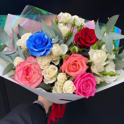 Роза цветная – 7 шт. Роза пионовидная – 1 шт. Кустовая роза – 2 шт. Тюльпан – 3 шт. Хризантема – 3 шт. Орнитогалум – 1 шт. Упаковка дизайнерская – 2 шт. Открыточка с вашими пожеланиями – 1 шт. инструкция по уходу за цветами – 1 шт.