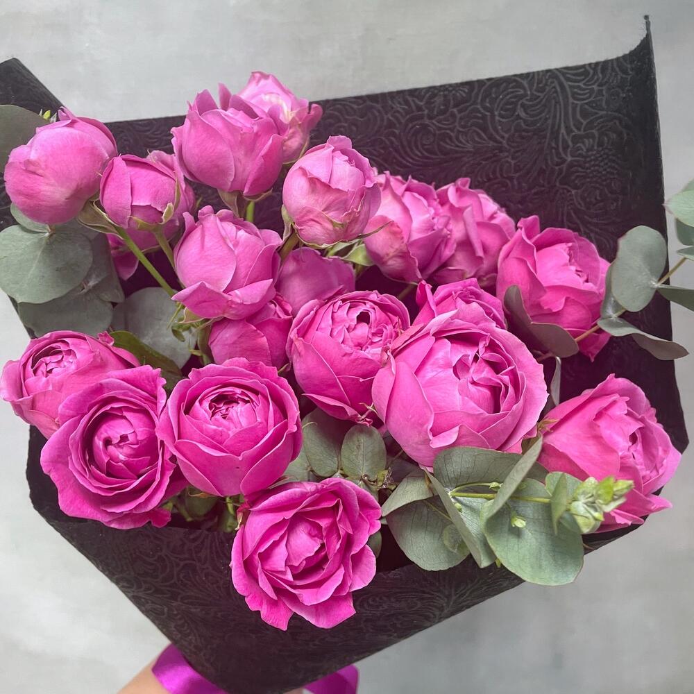 Роза кустовая пионовидная – 5 шт.Эвкалипт ценарея – 3 шт.Упаковка дизайнерская – 1 шт.