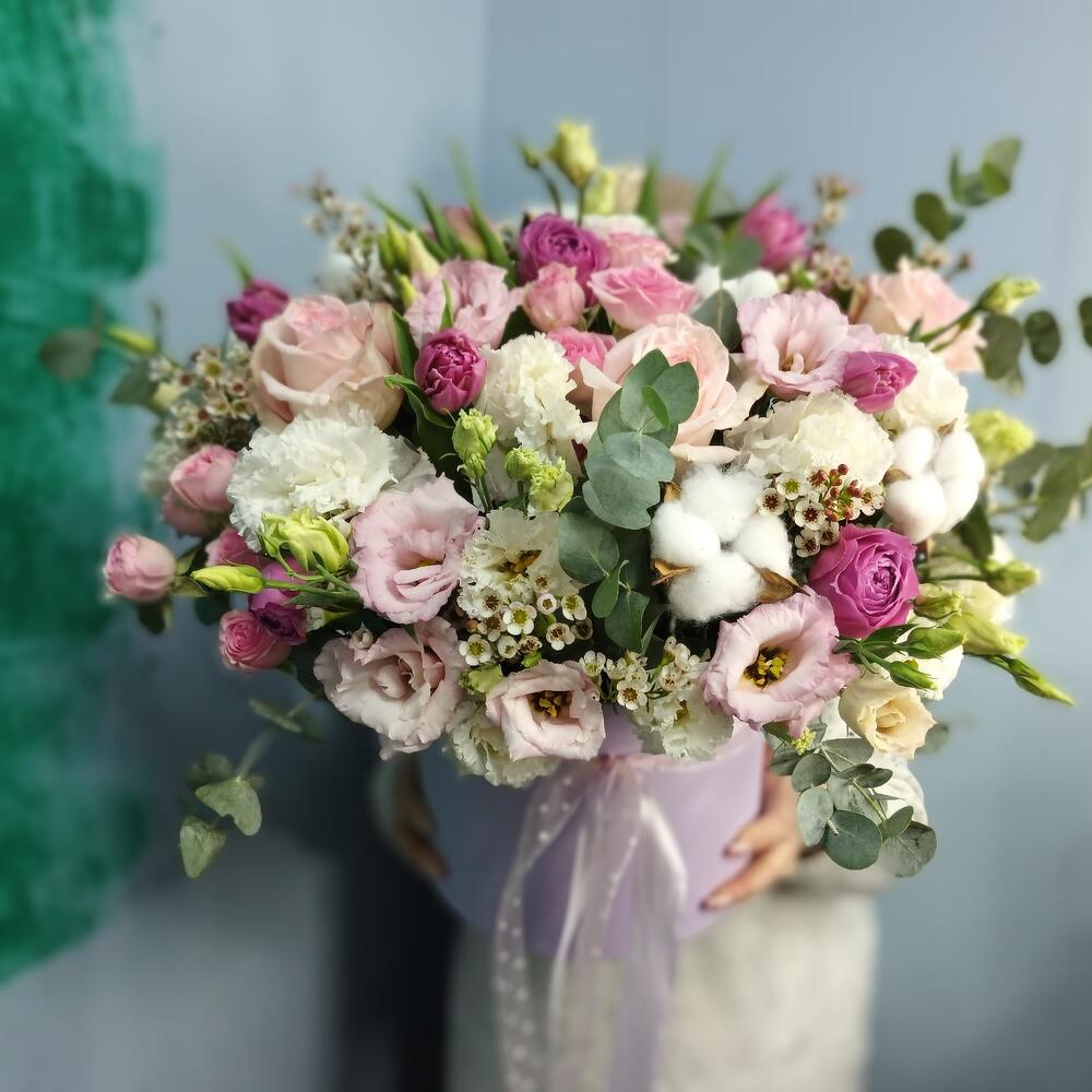 Коробка шляпная – 1 шт.Оазис флористический – 1 шт.Лента атласная – 2 шт.роза пинк охара(ароматная) – 5 шт.Тюльпан пионовидный – 7 шт.Эустома – 7 шт.Роза кустовая – 4 шт.Роза пионовидная кустовая – 4 шт.Хлопок натуральный – 6 шт.Хамелациум белый – 5 шт.Эвкалипт – 10 шт.