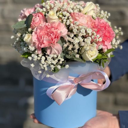 Оазис – 8 шт. Коробка – 1 шт. Оформление – 1 шт. роза белая и розовая – 75 шт.