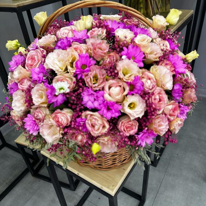 Роза – 29 шт. Хризантема – 33 шт. эустомы – 11 шт. зелень декоративная – 5 шт. Корзина плетеная – 1 шт.