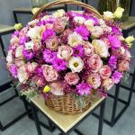 Роза – 29 шт. Хризантема – 33 шт. Эустома – 11 шт. декоративная зелень – 5 шт. Корзина плетеная – 1 шт.