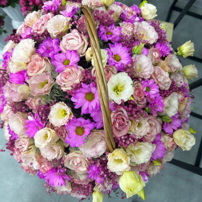 Роза – 29 шт. Хризантема – 33 шт. Эустома – 11 шт. декоративная зелень – 5 шт. Корзина плетеная – 1 шт.