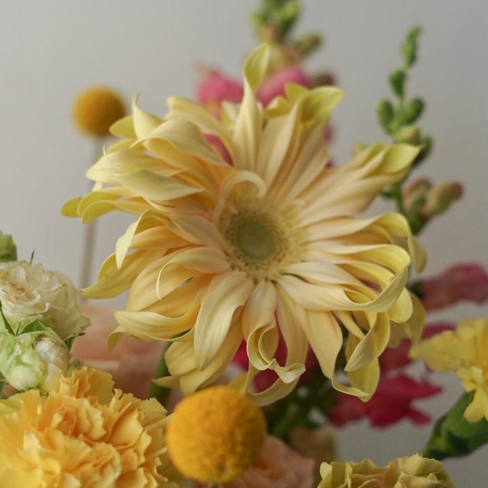 козина плетеная – 1 шт.Роза кустовая – 2 шт.Роза французская – 4 шт.гербера паста – 3 шт.Антуриум – 2 шт.Green bell – 5 шт.Диантус – 15 шт.Краспедия желтая – 5 шт.Лизиантус Алиса белый – 2 шт.