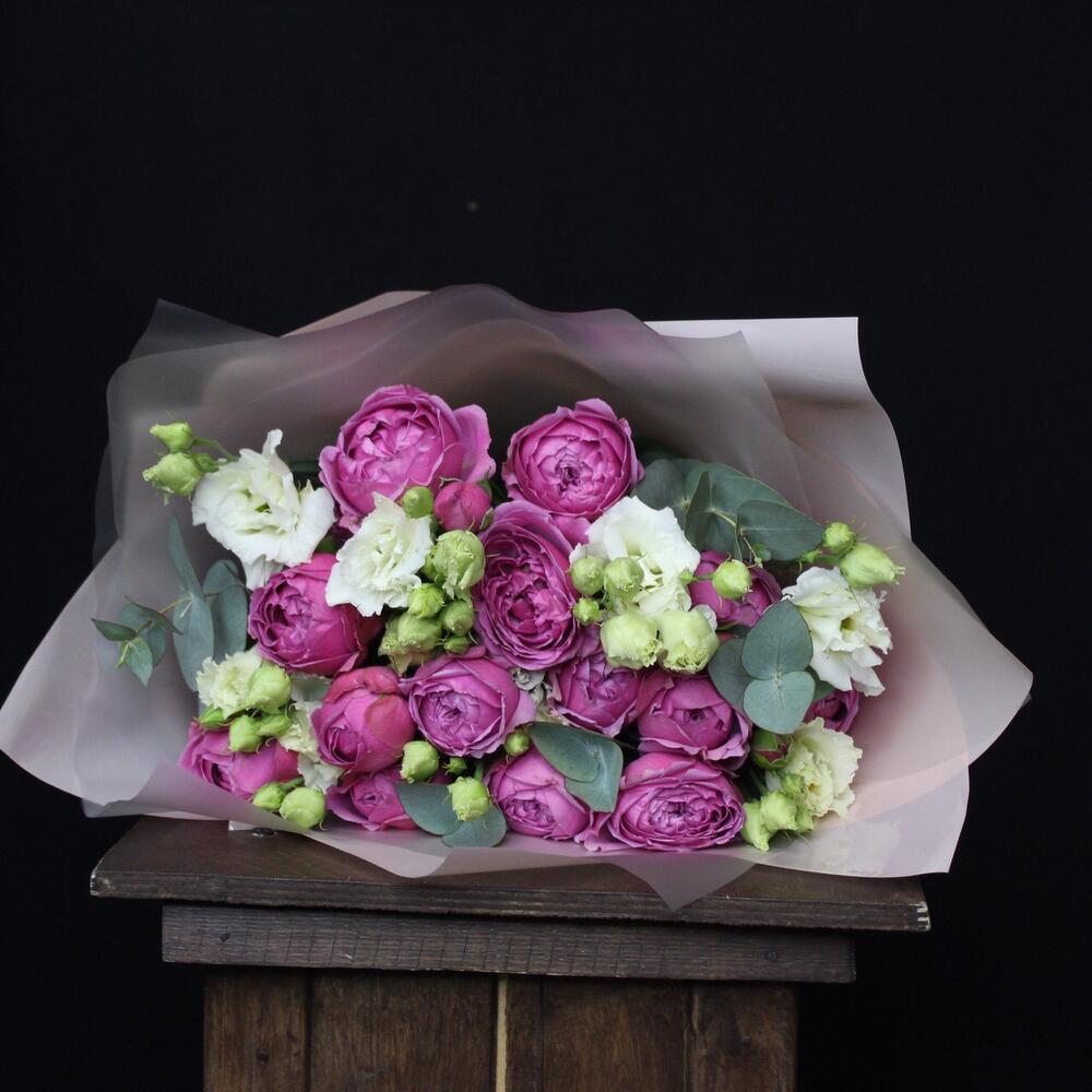 роза кустовая пионовидная misty bubbles – 4 шт.эустома махровая белая – 3 шт.Эвкалипт – 2 шт.Пленка матовая – 5 шт.Лента атласная – 2 шт.