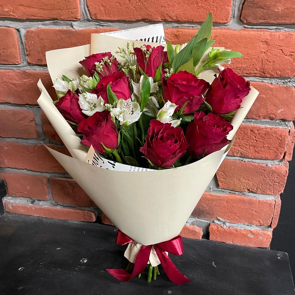 Роза красная – 9 шт.Альстромерия – 3 шт.Лимониум – 1 шт.Упаковка дизайнерская – 1 шт.Лента атласная – 1 шт.