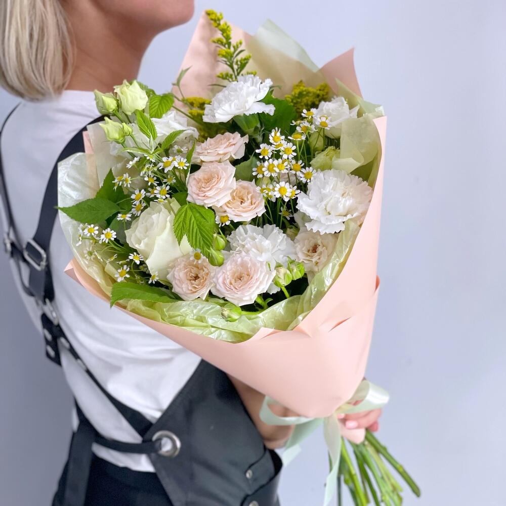 Роза Эквадор – 1 шт.Кустовая роза – 1 шт.Гвоздика – 3 шт.Ромашка кустовая – 2 шт.Лизиантус – 1 шт.Солидаго – 1 шт.Зелень – 1 шт.Упаковка дизайнерская – 1 шт.