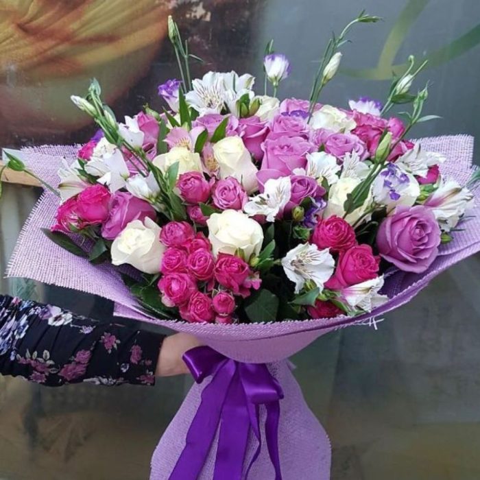 Альстромерия – 3 шт. Лента – 1 шт. Мешковина – 1 шт. Роза одноголовая местная 60 см – 15 шт. Роза кустовая местная – 3 шт.