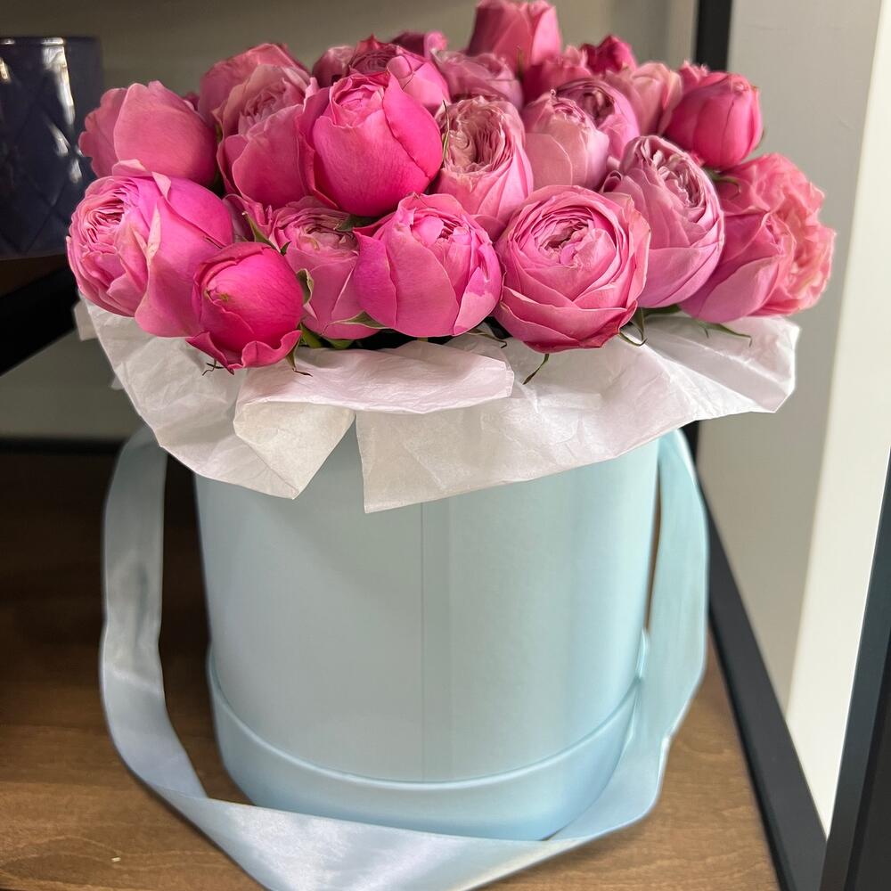 Шляпная коробка – 1 шт.Кустовая пионовидная роза – 11 шт.Тишью белое – 2 шт.аквапак с водой – 1 шт.