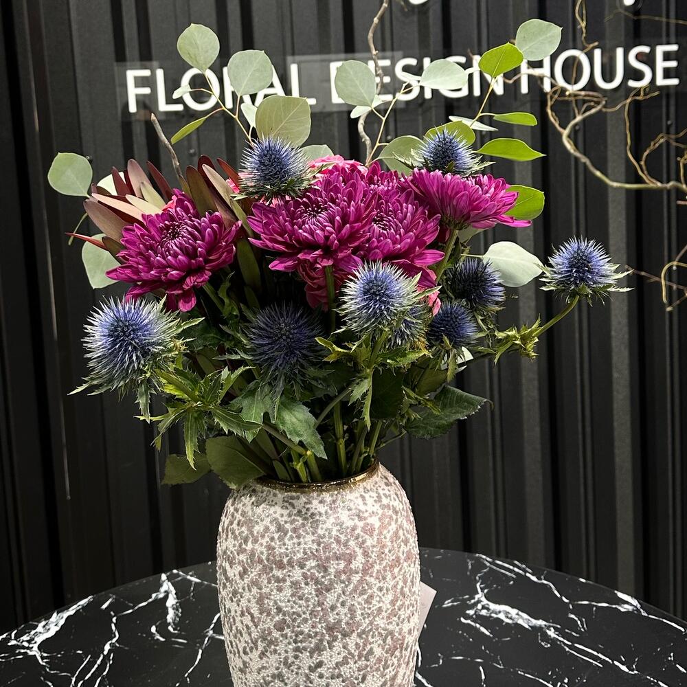 Категорий: Пионовидные розы, Розы, Хризантемы, Эвкалипт, Эрингиум