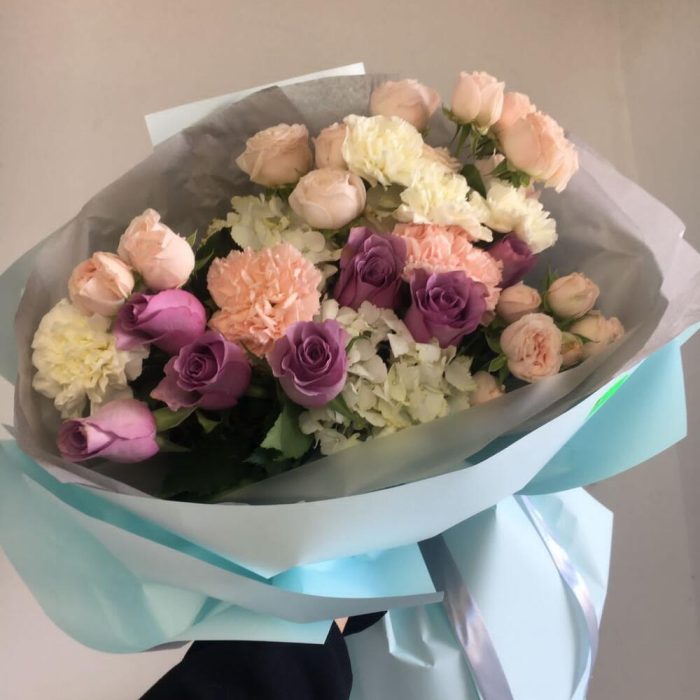 Букет из гортензии, эустомы и роз в стильной упаковке