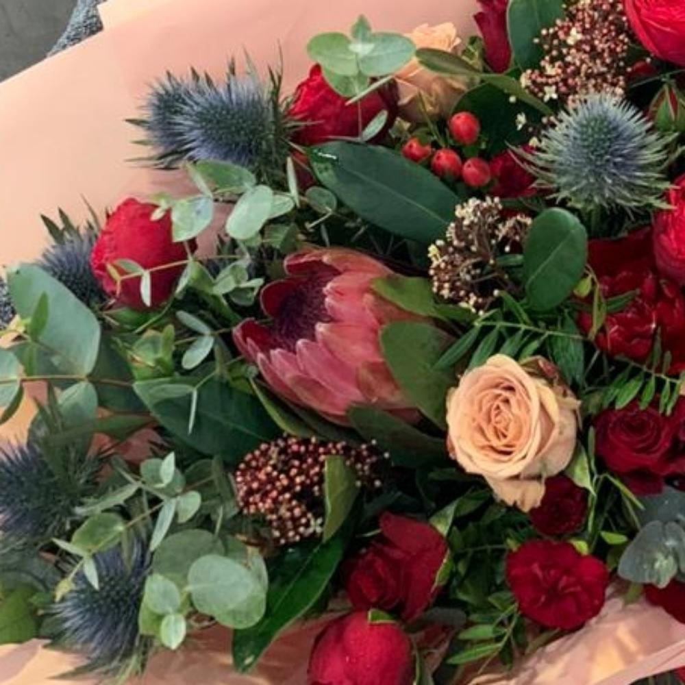 Роза – 7 шт.Роза кустовая – 5 шт.Протея – 1 шт.Гиперикум – 5 шт.Скиммия – 5 шт.Эрингиум – 4 шт.Эвкалипт – 5 шт.Лента атласная – 3 шт.Упаковка дизайнерская – 5 шт.