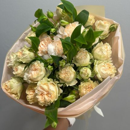 Пионовидная роза – 11 шт. Эвкалипт цинерария – 2 шт.