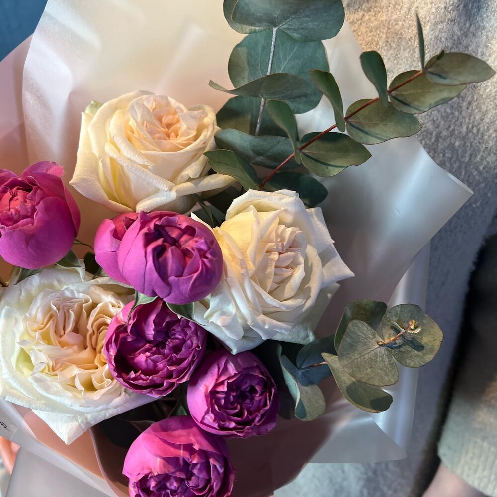 Нежный букет из самых ароматных цветов: премиальная white o’hara, пионовидная яркая кустовая роза и душистый эвкалипт