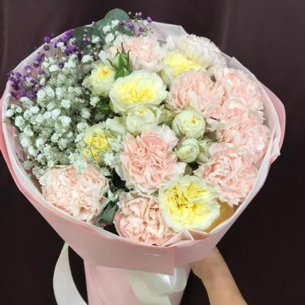 Флористы из студии “Varda Flowers” подобрали свежие и красивые цветы для создания букета, который наполнен положительными эмоциями и любовью. Они тщательно расположили каждый цветок в букете, учитывая его форму и цветовую гамму, чтобы достичь наилучшего гармоничного и красивого результата.