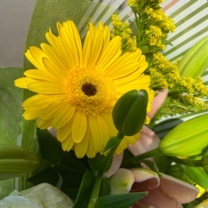 Лилия Азиатская розовая – 3 шт.Гербера – 3 шт.Роза Эквадор – 3 шт.Солидаго желтое – 2 шт.Упаковка дизайнерская – 1 шт.Лента атласная – 1 шт.