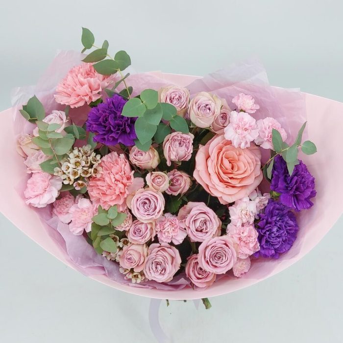 Нежный, ароматный, стильный букет в розово-сиреневых тонах. Такой букет всегда уместен и подойдёт для любого повода: День Рождения, именины, годовщина свадьбы, рождение ребенка, 8 марта, День Святого Валентина, выпускной и т.д. Можно вручить маме, сестре, подруге, коллеге, учителю, любимой.