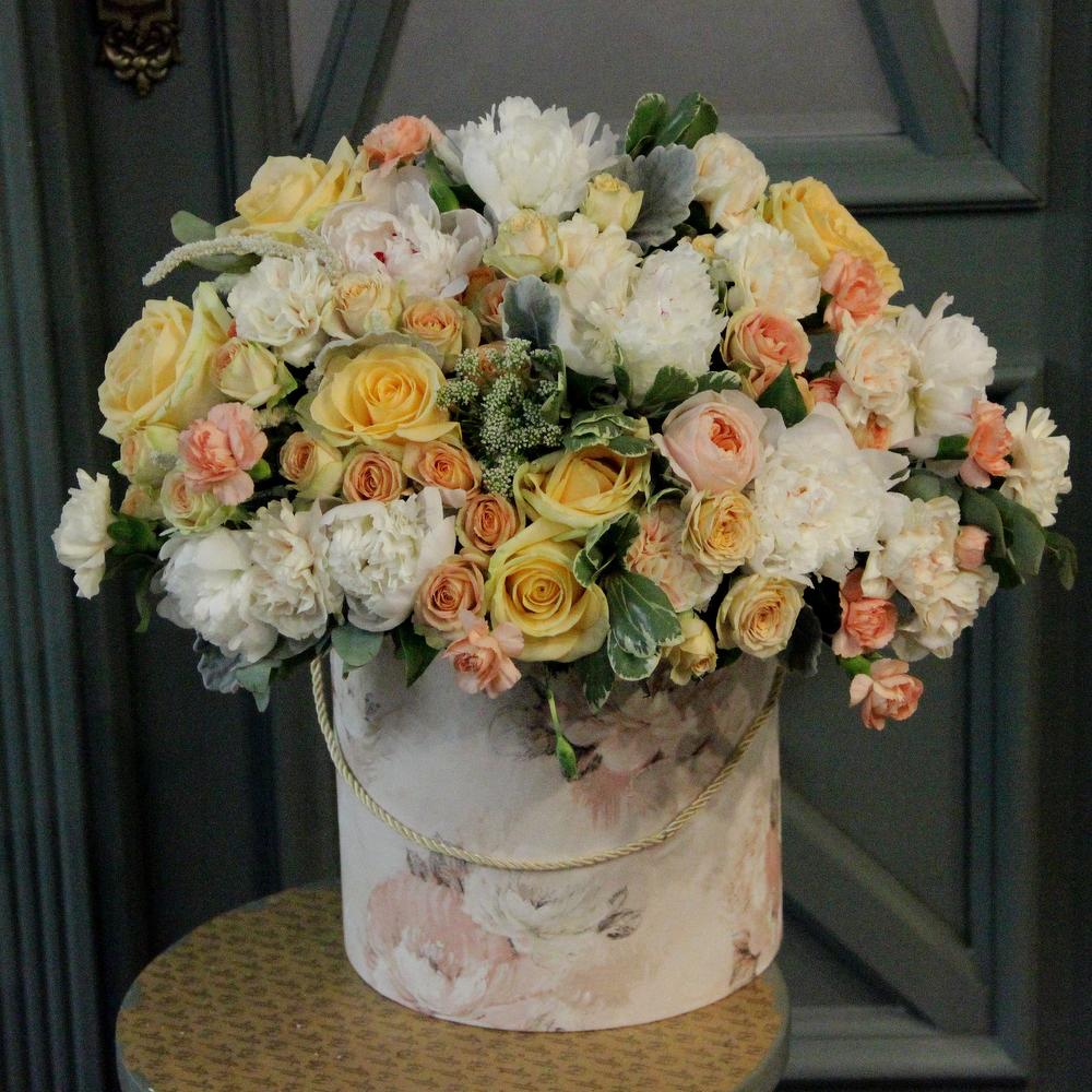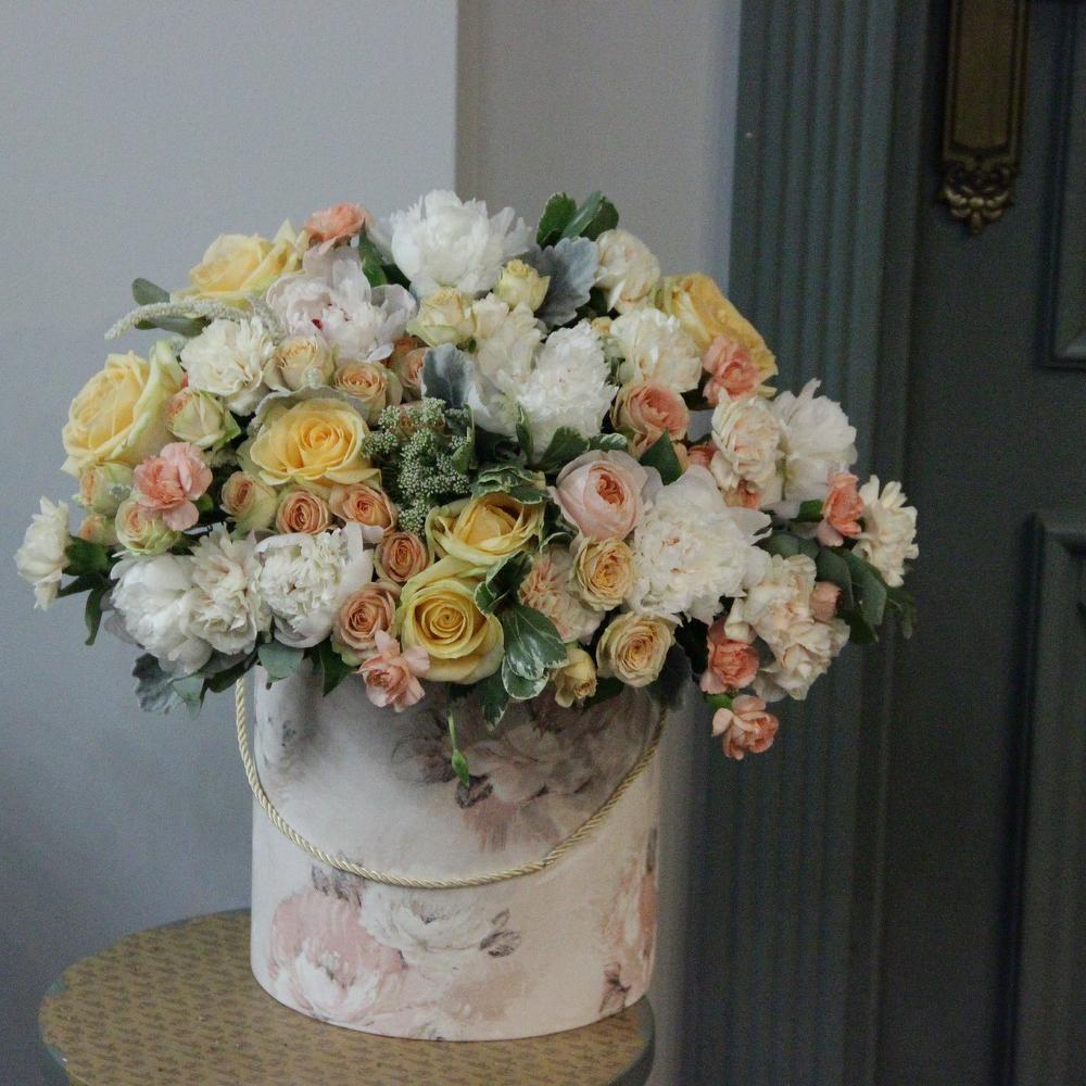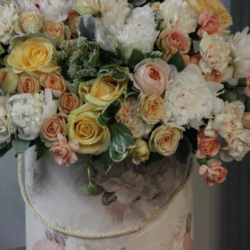 Роза сортовая – 11 шт.Роза кустовая – 7 шт.Пион – 7 шт.Гвоздика одноголовая – 9 шт.Гвоздика кустовая розовая – 5 шт.Эвкалипт – 5 шт.Питтоспорум илан – 5 шт.Коробка шляпная – 1 шт.